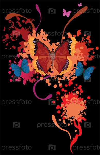 Разноцветные бабочки с пятнами краски на черном фоне