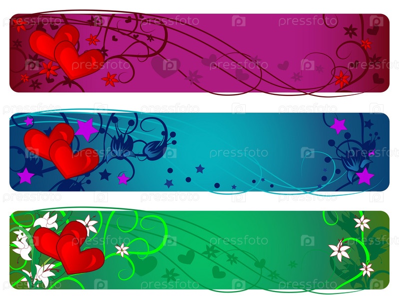 Два красных сердца в окружении цветов на трех цветных фонах