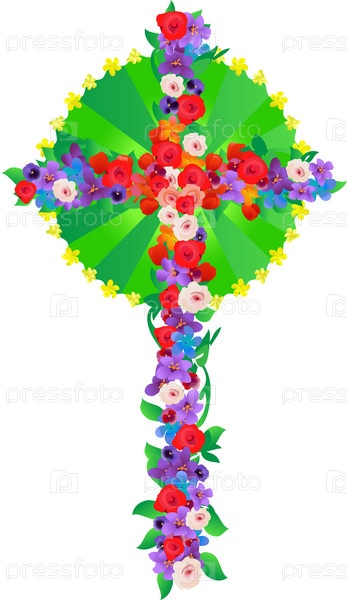 Христианский крест из цветов с зеленой аурой на белом фоне