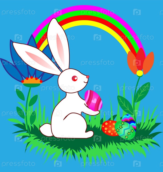 Белый кролик с пасхальными яйцами сидит на цветочном лугу под радугой
