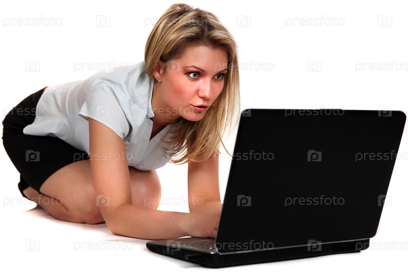 Удивленная девушка, сидящая перед ноутбуком