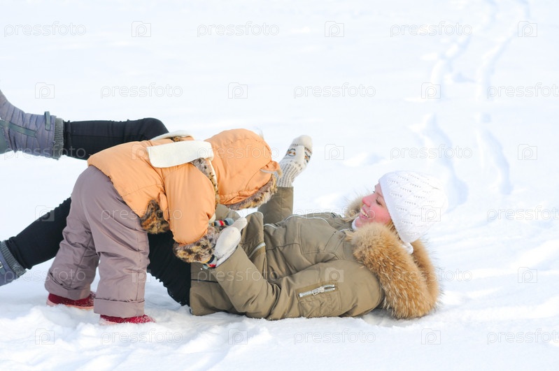 Мама с ребенком играют в снегу