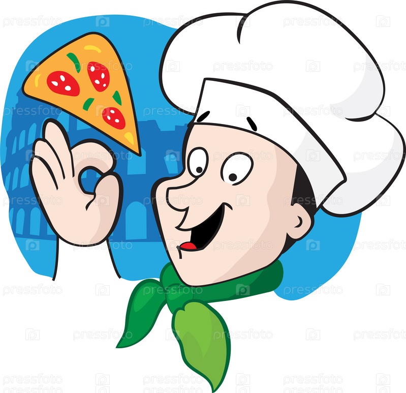 Веселый повар с куском итальянской пиццы на фоне Коллизея