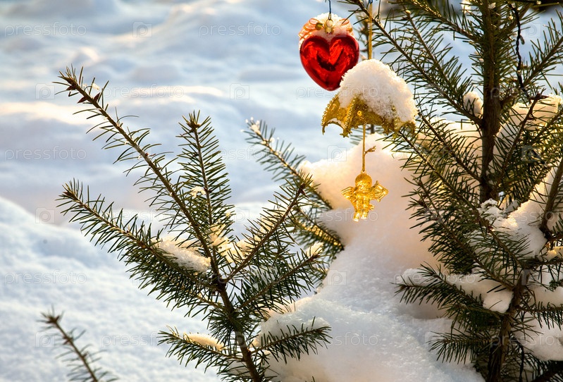 Елка с новогодними украшениями в снегу