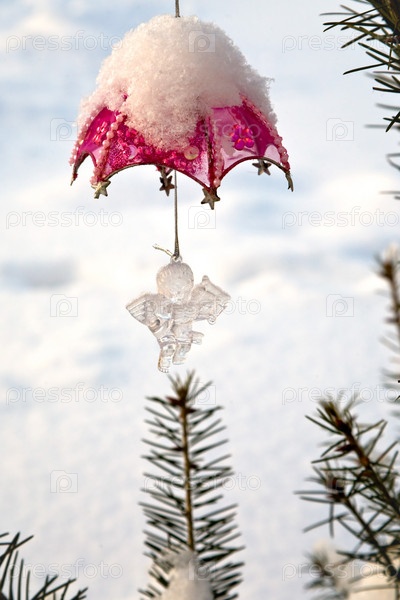 Рождественский ангел под розовым зонтиком на елке в зимнем лесу