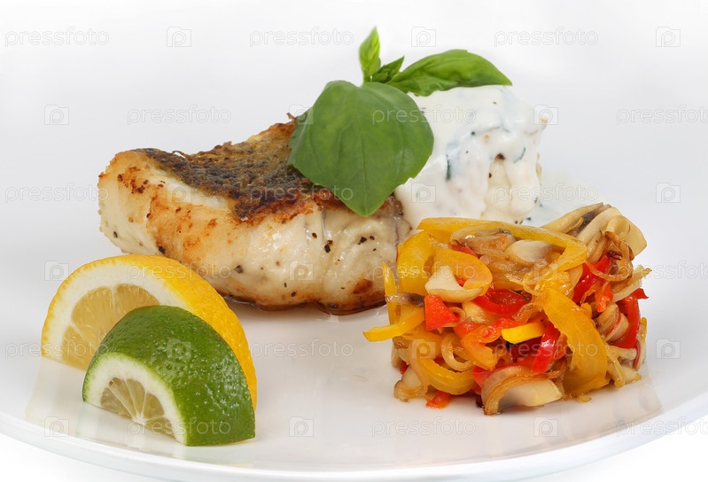 Жареная рыба с соусом, овощами и лимоном