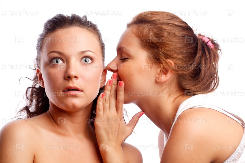 Молодая женщина что-то шепчет на ухо своей подруге на белом фоне