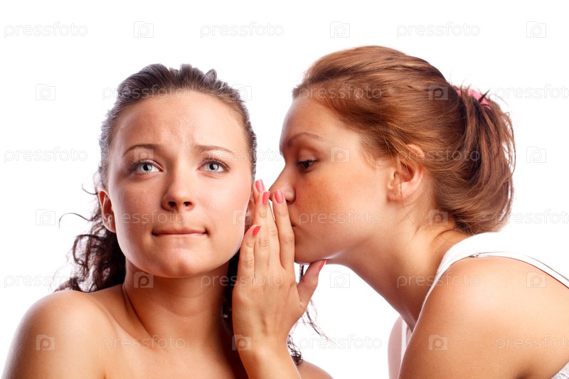 Молодая женщина что-то шепчет на ухо своей подруге на белом фоне