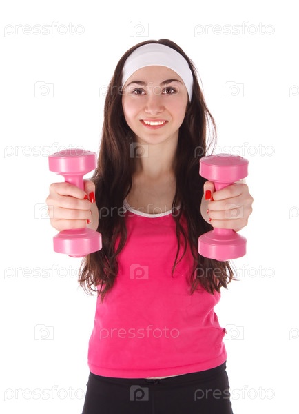 Девушка делает упражнение с гантелями