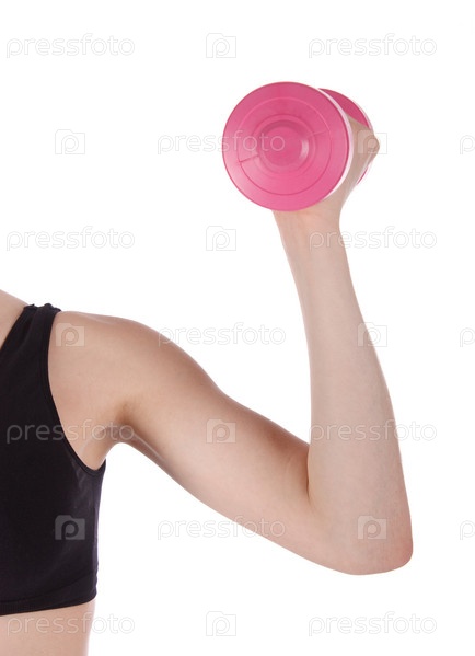 Девушка делает упражнение с гантелями