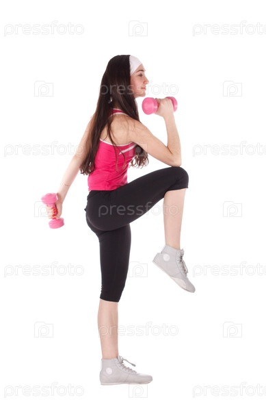 Девушка делает упражнение с гантелями