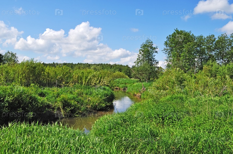 Летний пейзаж с речкой среди зеленой травы и деревьев