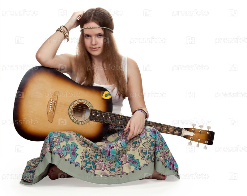 Девушка-хиппи с гитарой сидит на белом полу