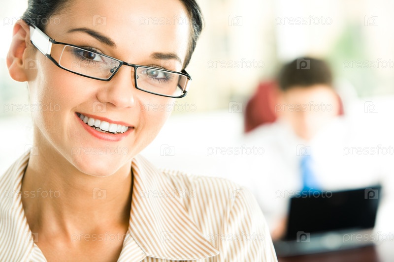 Портрет веселой женщины, глядящей в камеру на фоне рабочего мужчины