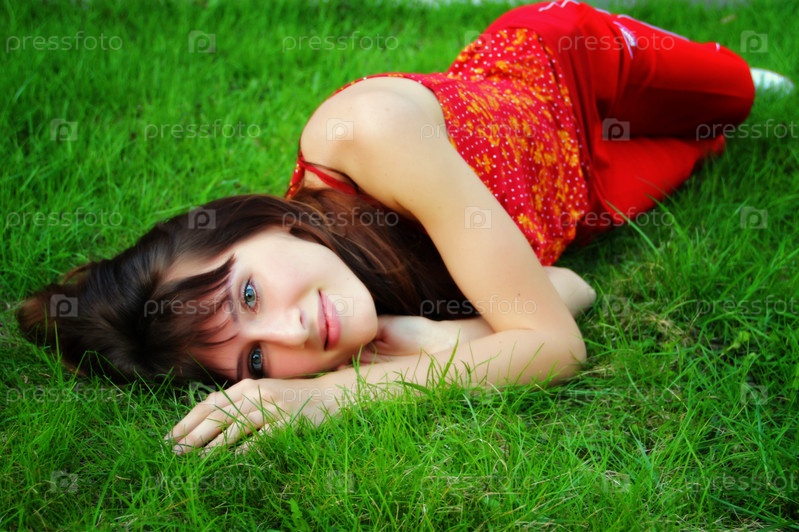Девушка лежит на траве