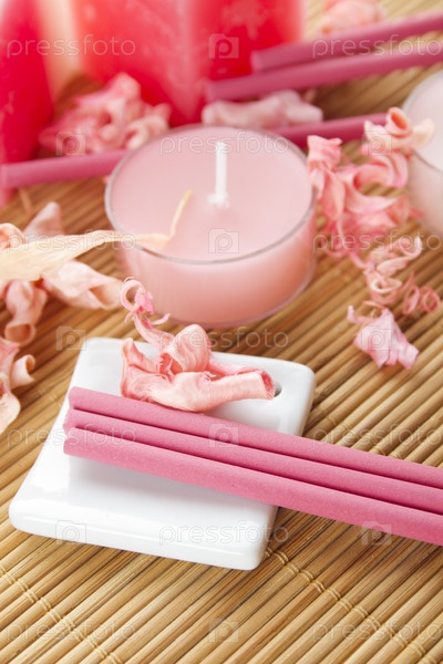 Ароматизированные розовые палочки со свечами на бамбуковой салфетке