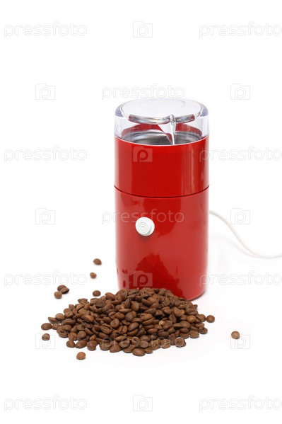 Кофемолка с кофейными зернами на белом фоне