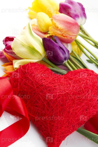 Тюльпаны и красное сердце на белом фоне