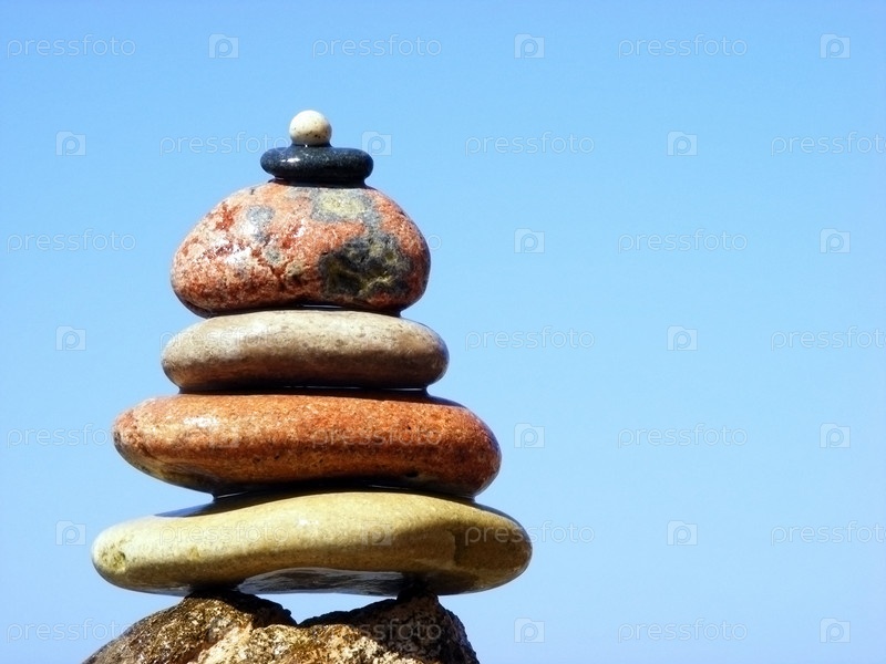 Пирамида из камней на фоне моря и неба с линией горизонта в солнце ясный безоблачный день