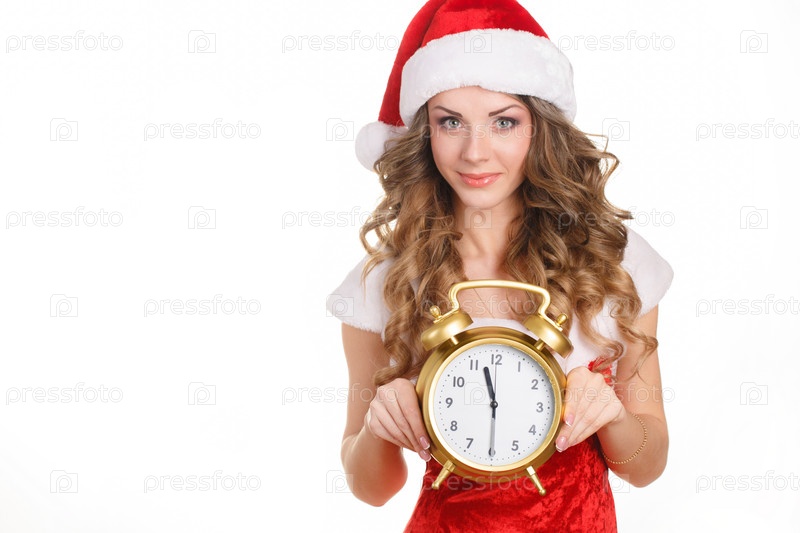Радостная девушка в колпаке Санта-Клауса держит часы