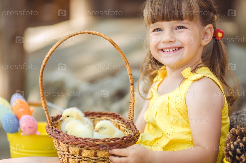 Маленькая девочка с цыплятами в деревне на свежем воздухе