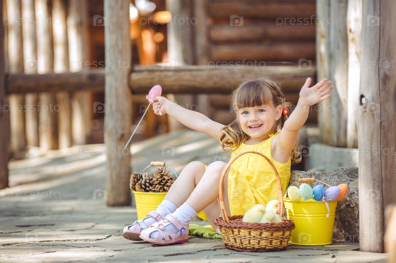 Маленькая девочка с цыплятами в деревне на свежем воздухе