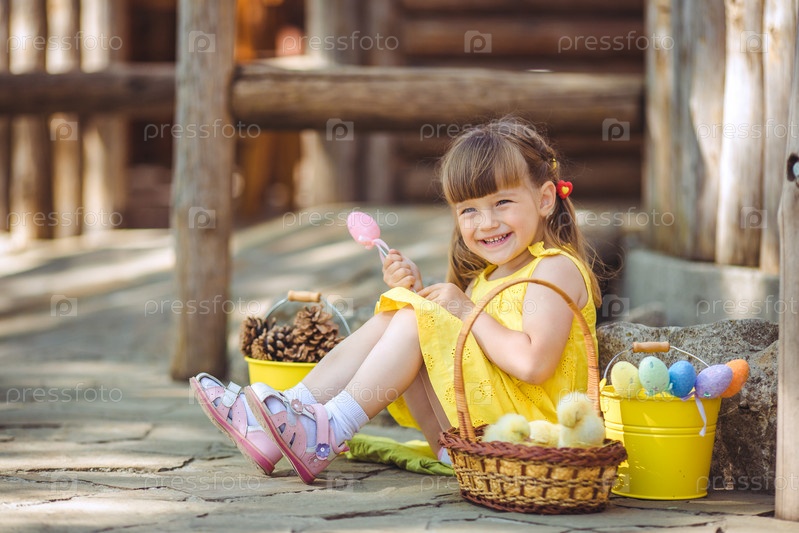 Маленькая девочка, играя с желтого цыпленка в деревне на свежем воздухе