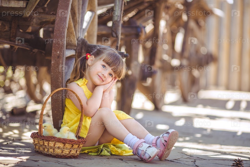 Маленькая девочка с цыплятами в деревне на свежем воздухе