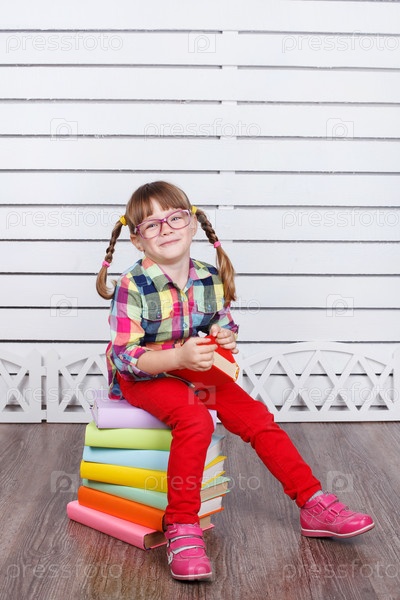 девочка сидит на стопке учебников