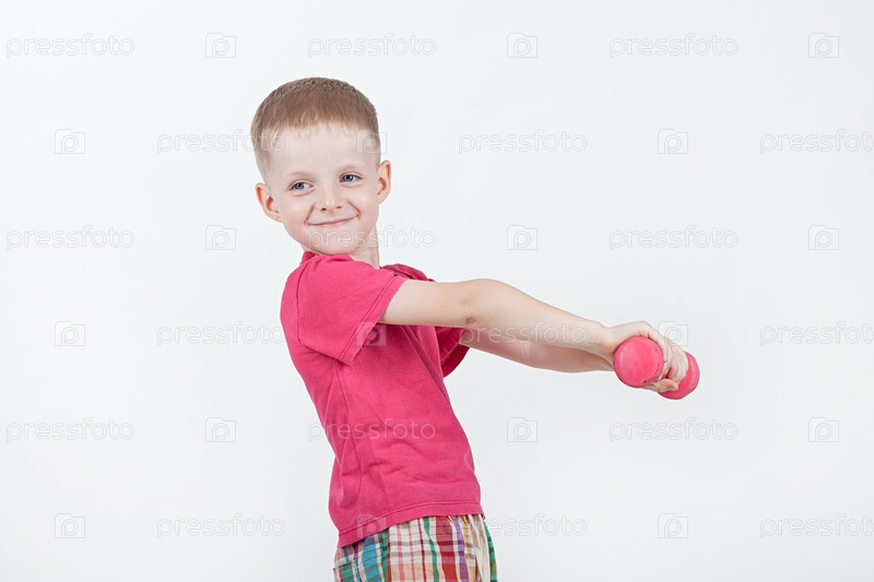 Улыбающийся мальчик делает упражнения с гантелями