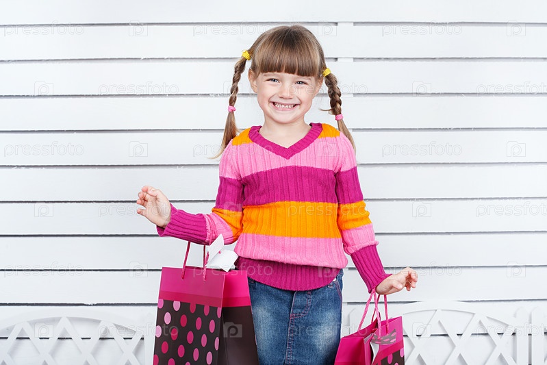 Девочка с бумажными пакетами на белом фоне