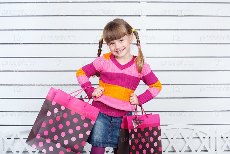 Девочка с бумажными пакетами на белом фоне