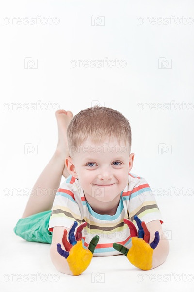 Счастливый мальчик с красками на руках