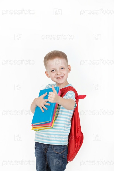 Счастливый школьник с рюкзаком и книгами
