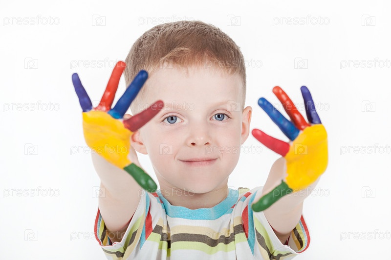 Счастливый мальчик с красками на руках