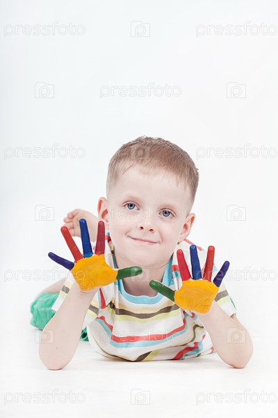 Счастливый мальчик с красками на руках