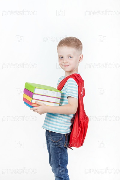 Счастливый школьник с рюкзаком и книгами