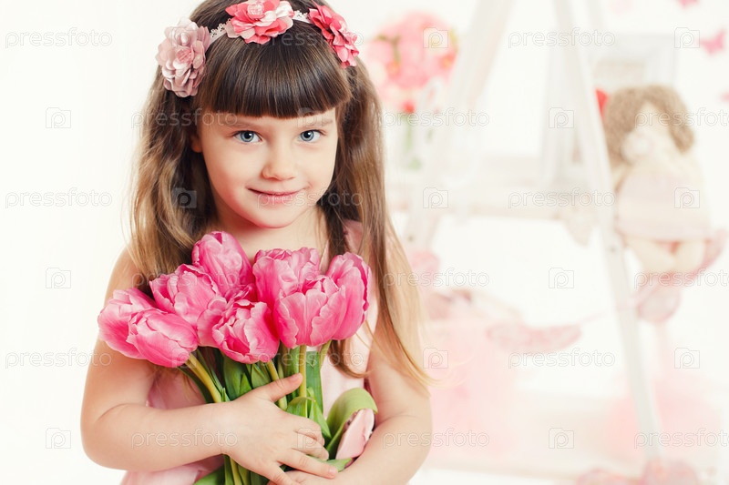 Девочка с букетом розовых тюльпанов