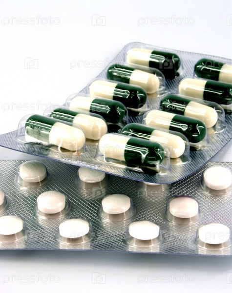 Пузыри капсулы и таблетки на белом фоне