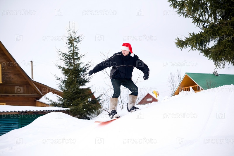 Парень в красном новогоднем колпаке катается на сноуборде в сельской местности