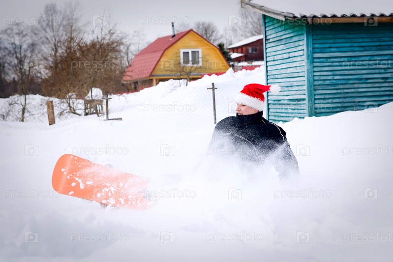 Человек в красном новогоднем колпаке катается на сноуборде в сельской местности