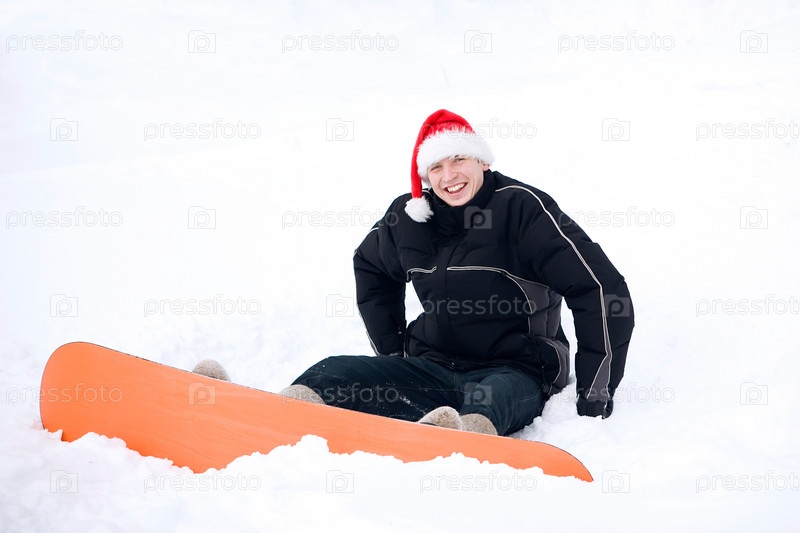 Веселый молодой человек в новогоднем колпаке сидит в снегу со сноубордом