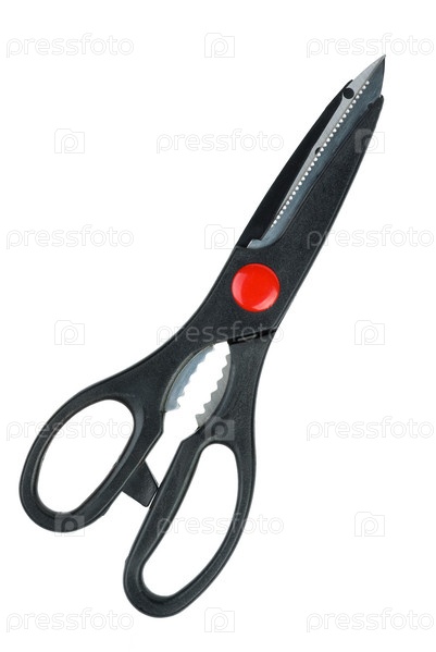 Закрытые черные кухонные ножницы на белом фоне