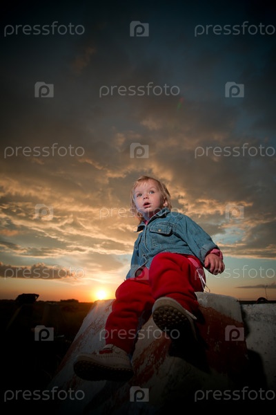 Ребенок в куртке сидит на бетонном блоке на закате