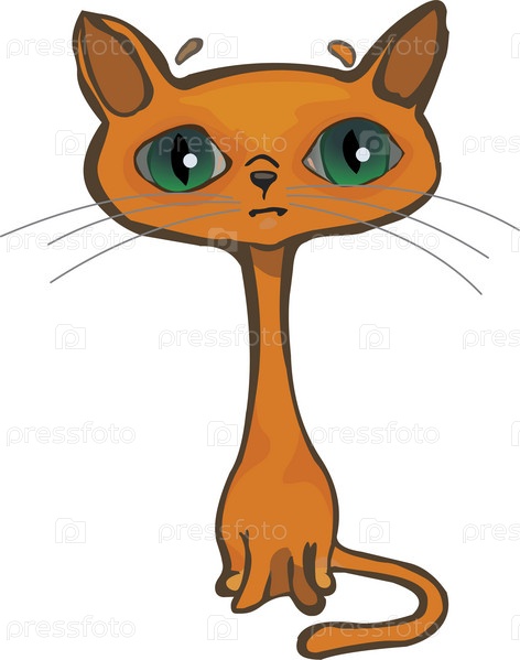 Нарисованный печальный котенок с зелеными глазами на белом фоне
