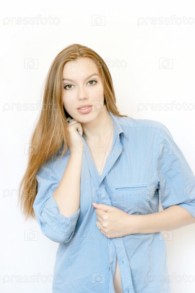 Длинноволосая девушка позирует на белом фоне