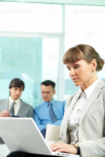 Деловая женщина, работающая за ноутбуком, на фоне своих коллег