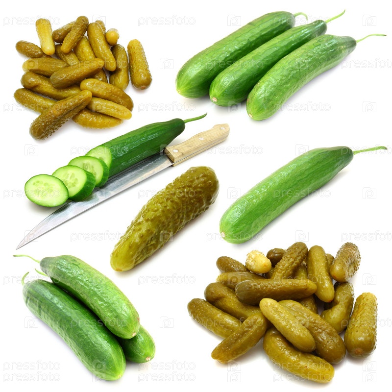 Маринованные и свежие огурцы на белом фоне
