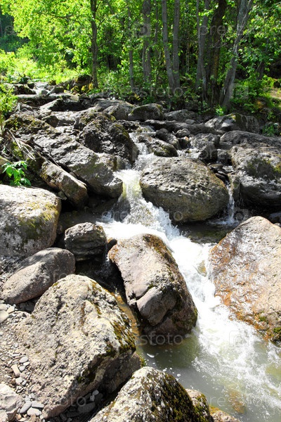 Водопад среди камней в лесу