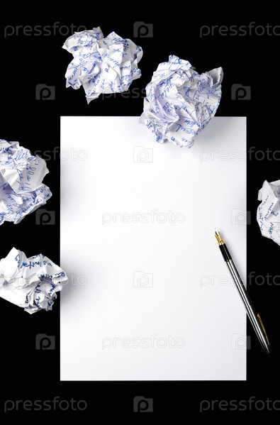 Чистый лист, ручка и скомканная бумага на черном фоне